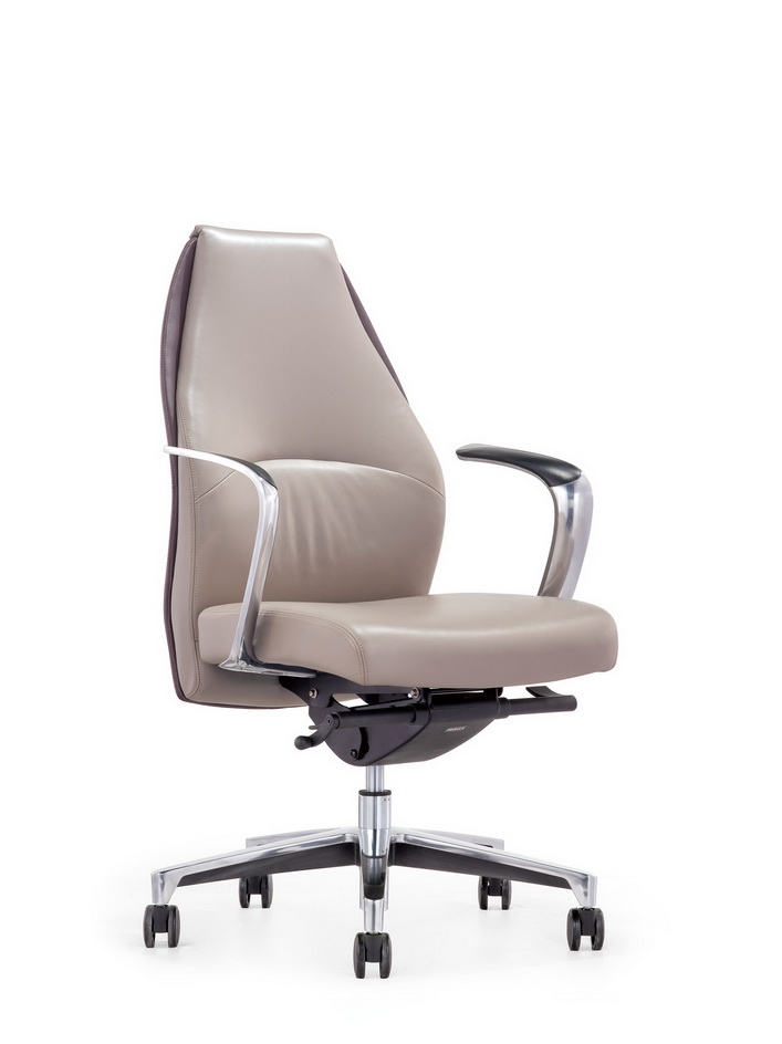 Stolen leveres i beste kvalitets skinn og lagerføres i brun/beige (som bilde) eller i sort. Kryss og armlener i polert aluminium. Synkron mekanisme med tyngderegulering og låsing av vipp i ønsket posisjon. Gasslift for høyderegulering. Som konferansestol kan den leveres uten armlener og glidere i stede for trinser. Som tillegg kan stolen leveres med memory lift som vender stolen tilbake til utgangsposisjon etter bruk. |
